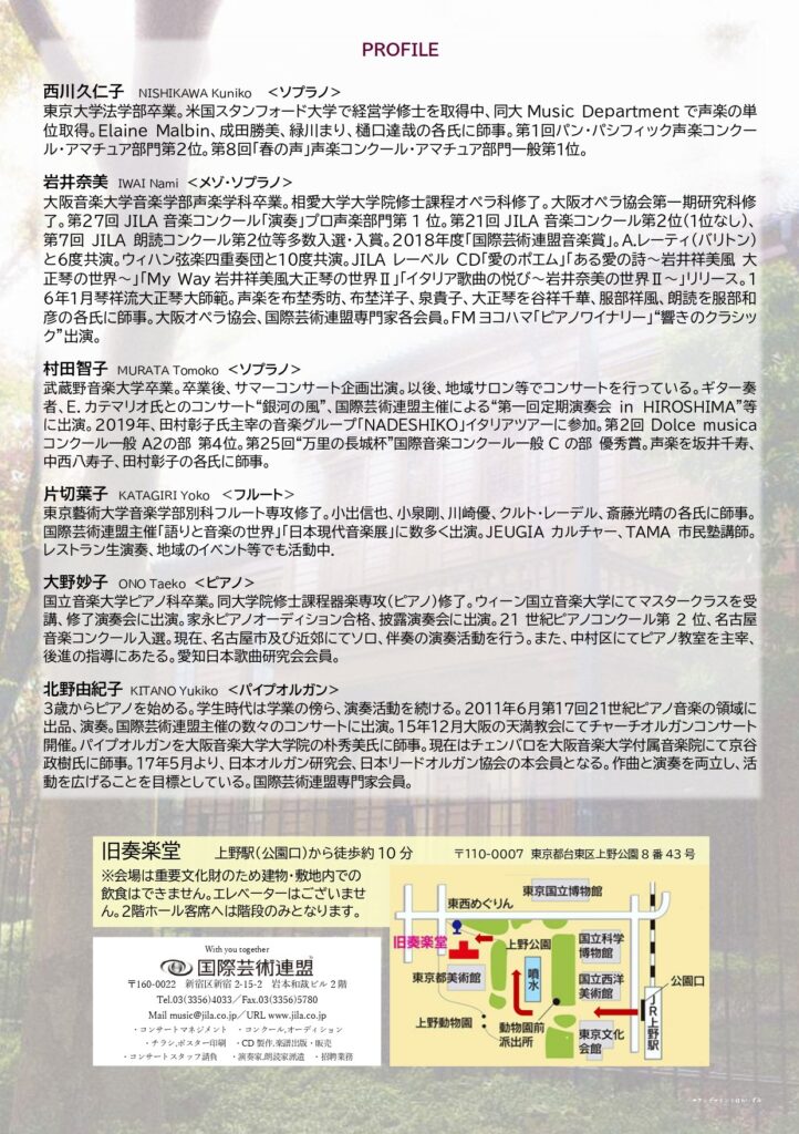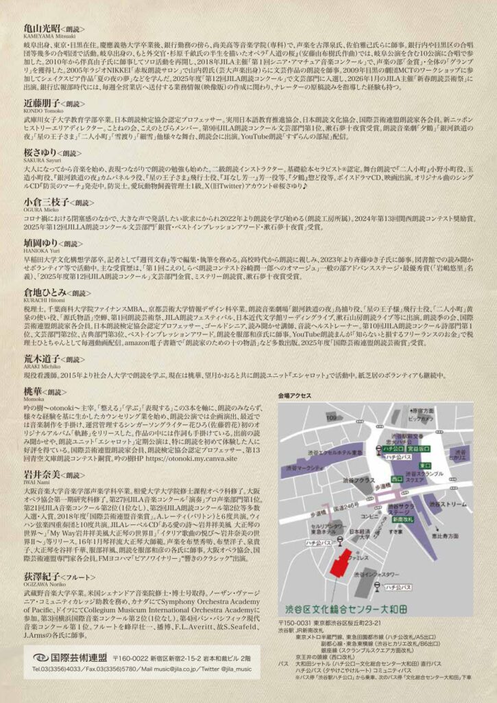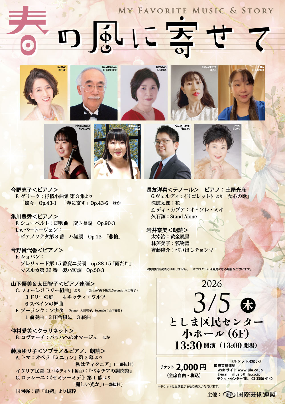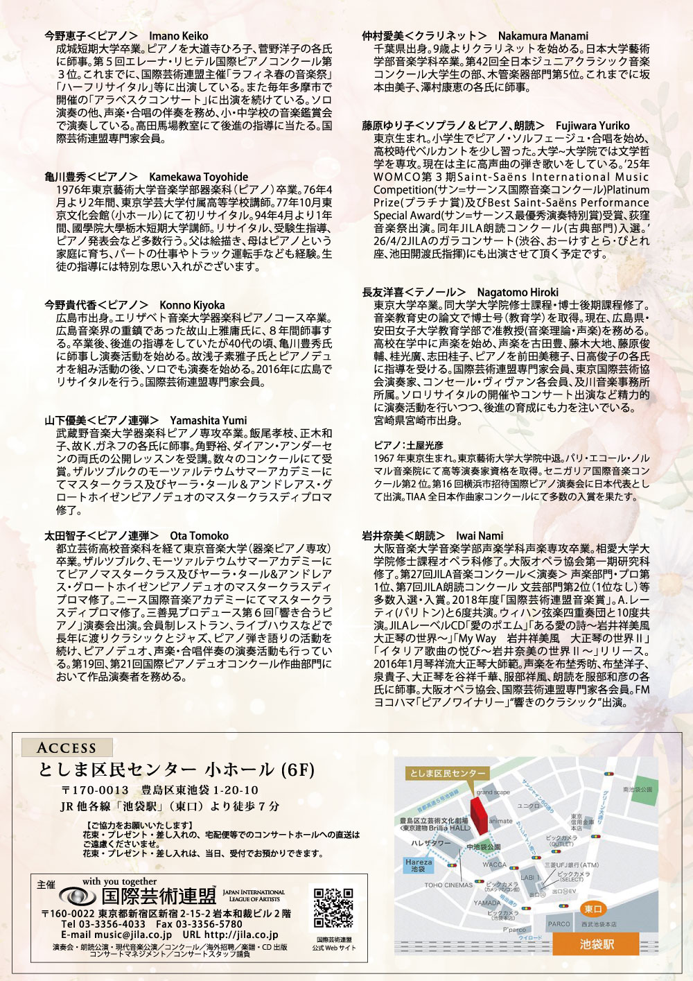 藤原ゆり子<ソプラノ&ピアノ、朗読> A.トマ:オペラ『ミニョン』第2幕より「私はティタニア」(一部抜粋) A.Thomas:Opera《Mignon》“Je suis Titania”excerpted イタリア民謡(J.ベネディクト編曲):『ベネチアの謝肉祭』 Italian Traditional(arranged by J.Benedict): “Carnival of Venice” G.ロッシーニ:オペラ『セミラーミデ』第1幕より「麗しい光が」(一部抜粋) G.Rossini:Opera《Semiramide》“Bel raggio lusinghier”excerpted 世阿弥:能『山姥』より抜粋