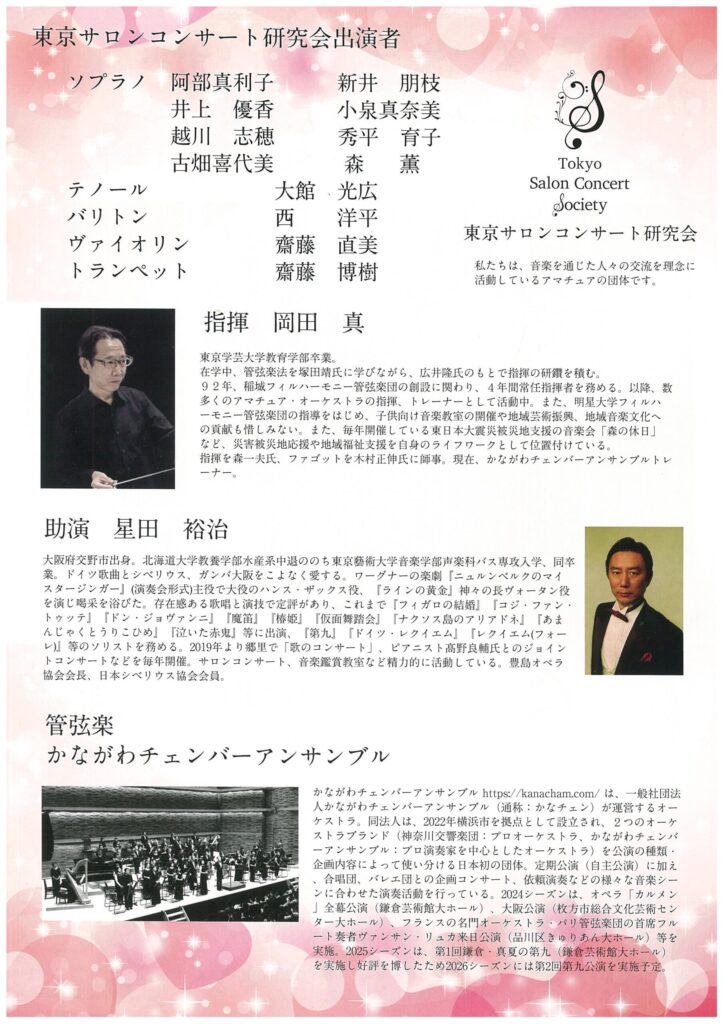 公演名、日時、会場、出演者、プログラム、チケット料金、主催者、ほかの後援名義団体(ある場合)、問い合わせ先